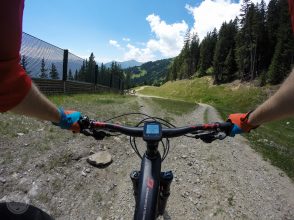 Nach leidiger gestriger Anfahrt, 8,5 Stunden, empfängt uns SFL (Region Serfaus-Fiss-Ladis) mit 32 °C und Sonnenschein. Bevor das Wetter die nächsten Tage umschlägt heißt es schnell die ersten Abfahrten zu erkunden. Da wir einfach nicht aus dem Bett gekommen sind, lasse ich den Bikepark für heute Links liegen und wir fahren mit der Schönjochbahn, dank Supi-Spitze-Prima-Sommer-Karte kostenfrei*, auf 2.417 Meter (* Bike kostet 10 Euro extra).